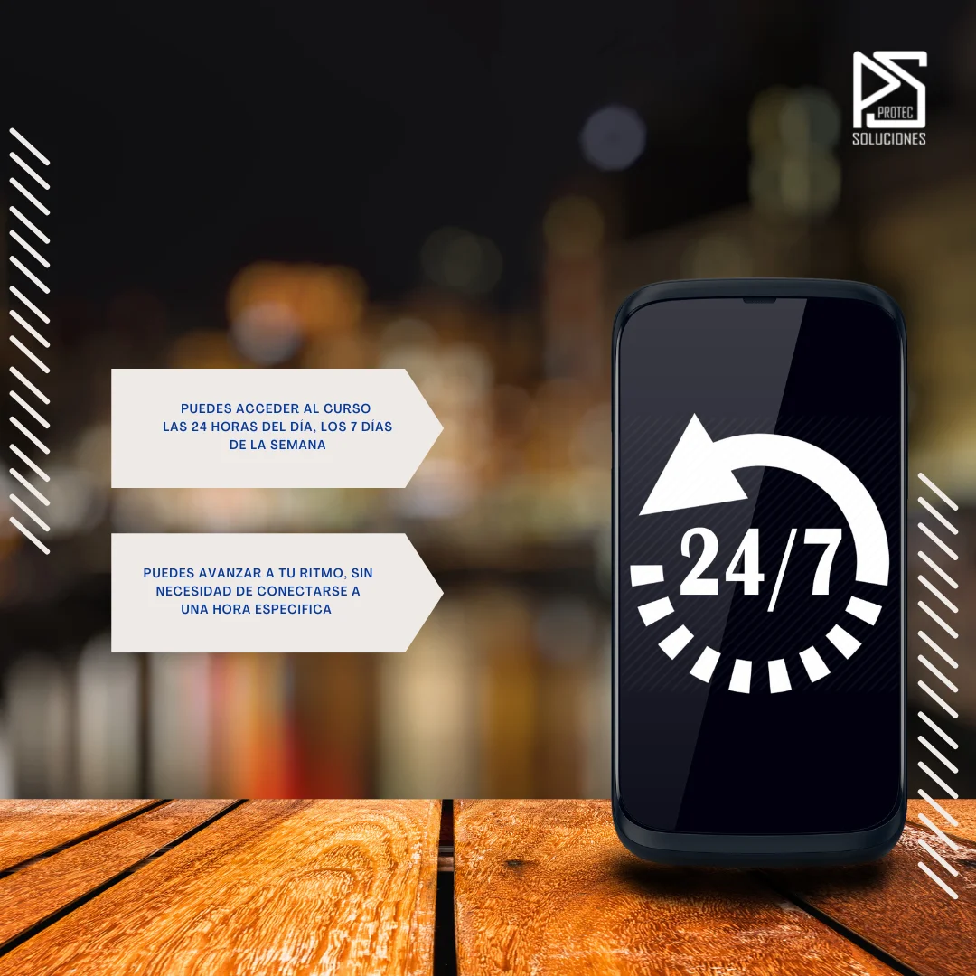 • El curso está disponible las 24 horas, los 7 días de la semana, incluyendo festivos.